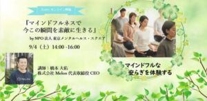 みなさんにマインドフルネスによる安らぎを体験していただきたい マインドフルネスは道具も特別な場所も必要なく、いつでも誰もが実行することができます。 今回のウェビナーではマインドフルネス・サロンを運営する株式会社Melonの橋本代表にご登壇いただき、マインドフルネスの概要、科学的な根拠をご説明いただくとともに、インストラクターによる本格的なマインドフルネスを体験していただきたいと思っています。 きっと数10分の取組で心が静かに、穏やかに変化する驚きの体験を実感いただけるはずです。