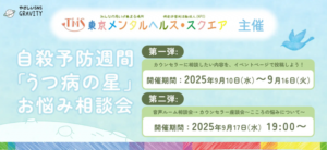 やさしいSNS「GRAVITY」で お悩み相談/質問会 イベントを開催 私たち東京メンタルヘルス・スクエアでは自殺予防週間である25.09.10(水)~16(火)に合わせてHiClub株式会社が提供する、や […]